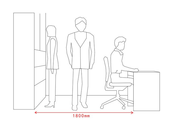 6.1.3 前臺員工活動后方距離墻體或物體需預留不少于0.9m通道。